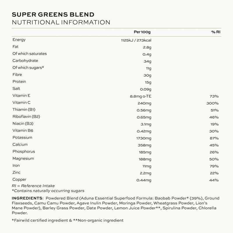 Organic Ingredients: Powdered Blend (Aduna Essential Superfood Formula: Baobab Powder* (39%), Ground Flaxseeds, Camu Camu Powder, Agave Inulin Powder, Moringa Powder, Wheatgrass Powder, Lion's Mane Powder), Barley Grass Powder, Date Powder, Lemon Juice Powder**, Spirulina Powder, Chlorella Powder. *FairWild™ certified ingredient **Non-organic ingredients.