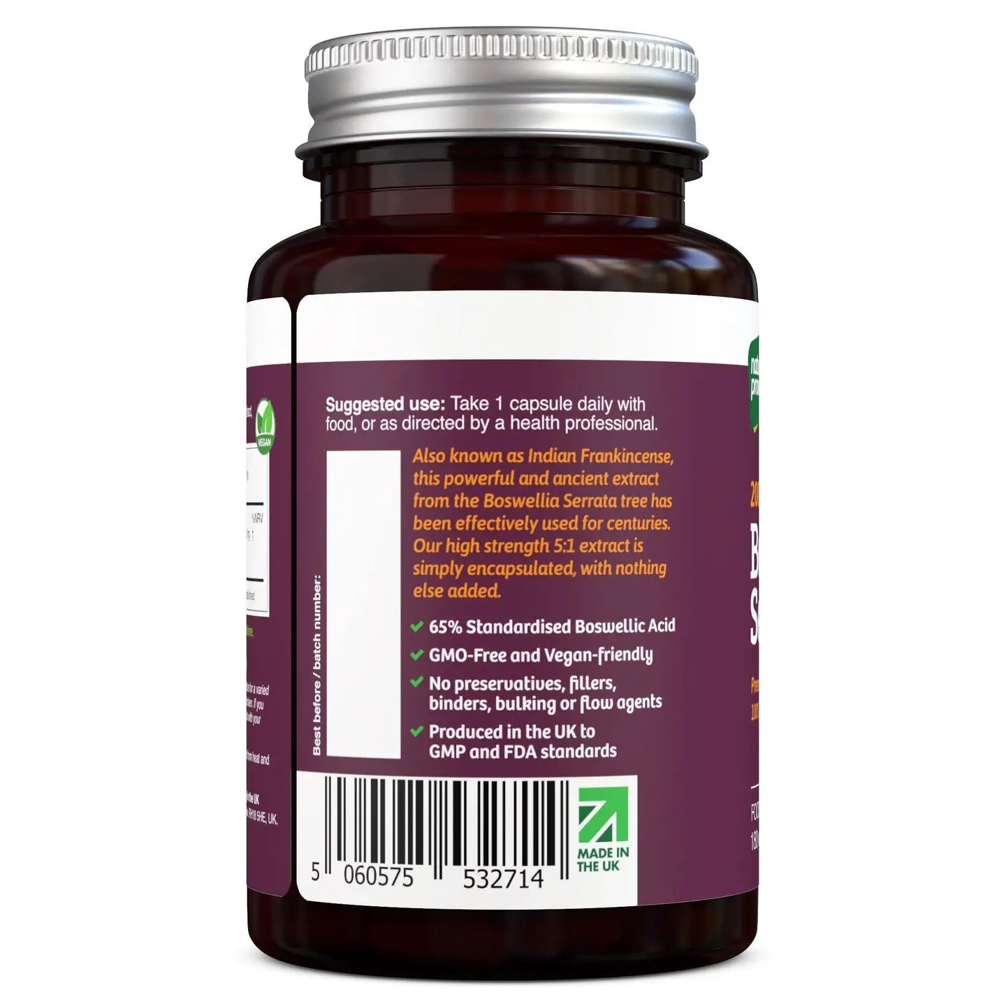 Ingredients: Boswellia Serrata 5:1 Extract, Vegetable capsule (HMPC). 2000mg | 65% Standardised
