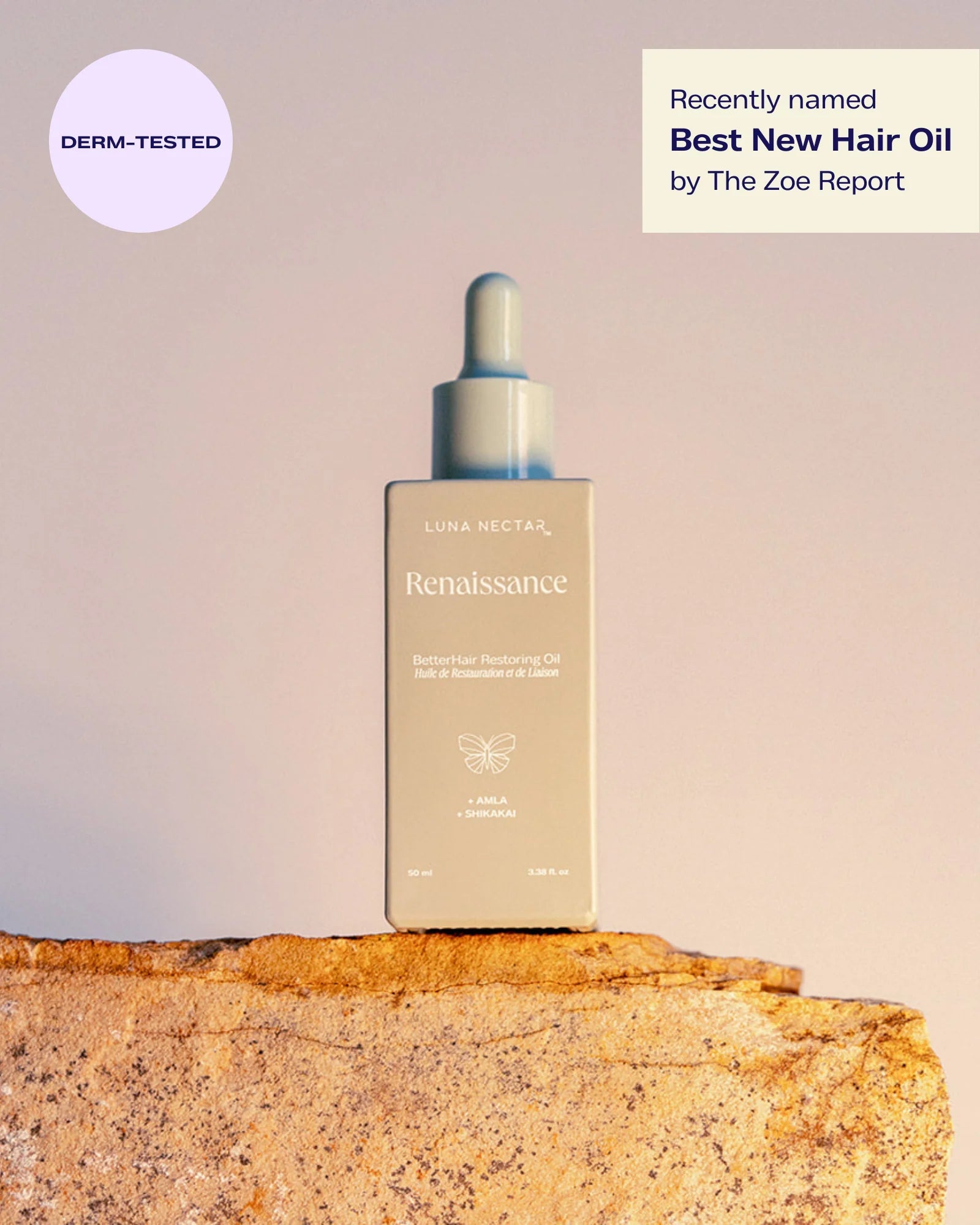 Indulge in the luxury of Luna Nectar Ayurvedic Renaissance Hair Oil, made with Ayurvedic herbs that have been revered for centuries and now scientifically proven to nourish and rejuvenate damaged, dehydrated, and over-processed hair.